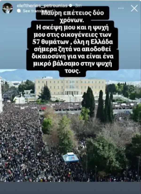 Ο Λευτέρης Πετρούνιας σχολίασε με τον δικό του τρόπο τη «μαύρη» επέτειο γράφοντας: «Μαύρη επέτειος δύο χρόνων. Η σκέψη μου κι η ψυχή μου στις οικογένειες των 57 θυμάτων, όλη η Ελλάδα σήμερα ζητά να αποδοθεί δικαιοσύνη για να είναι ένα μικρό βάλσαμο στη ψυχή τους», ήταν το σχόλιο που έκανε ο Έλληνας Ολυμπιονίκης σε story στον προσωπικό του λογαριασμό στο Instagram.