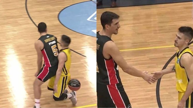 Ο Λαρεντζάκης έκανε ένα πολύ σκληρό φάουλ στον Στασινό, με τον παίκτη του Αμαρουσίου να σωριάζεται και τον παίκτη του Ολυμπιακού να του ζητάει αμέσως συγγνώμη.
