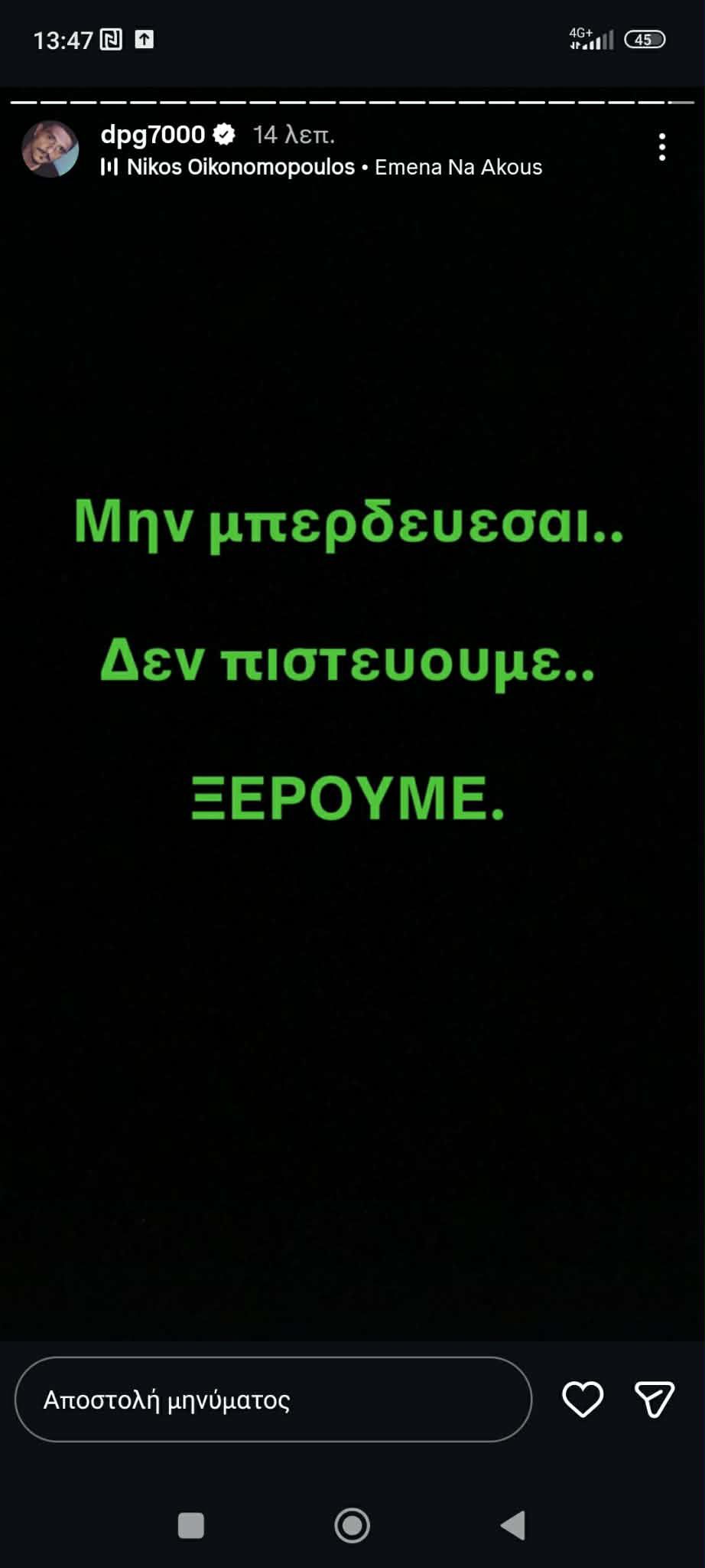 Η απάντηση του Δημήτρη Γιαννακόπουλου ήρθε λίγο αργότερα μέσω story στο Instagram. «Μην μπερδεύεσαι. Δεν πιστεύουμε. Ξέρουμε!», ανάφερε ο ισχυρός άνδρας του τριφυλλιού.