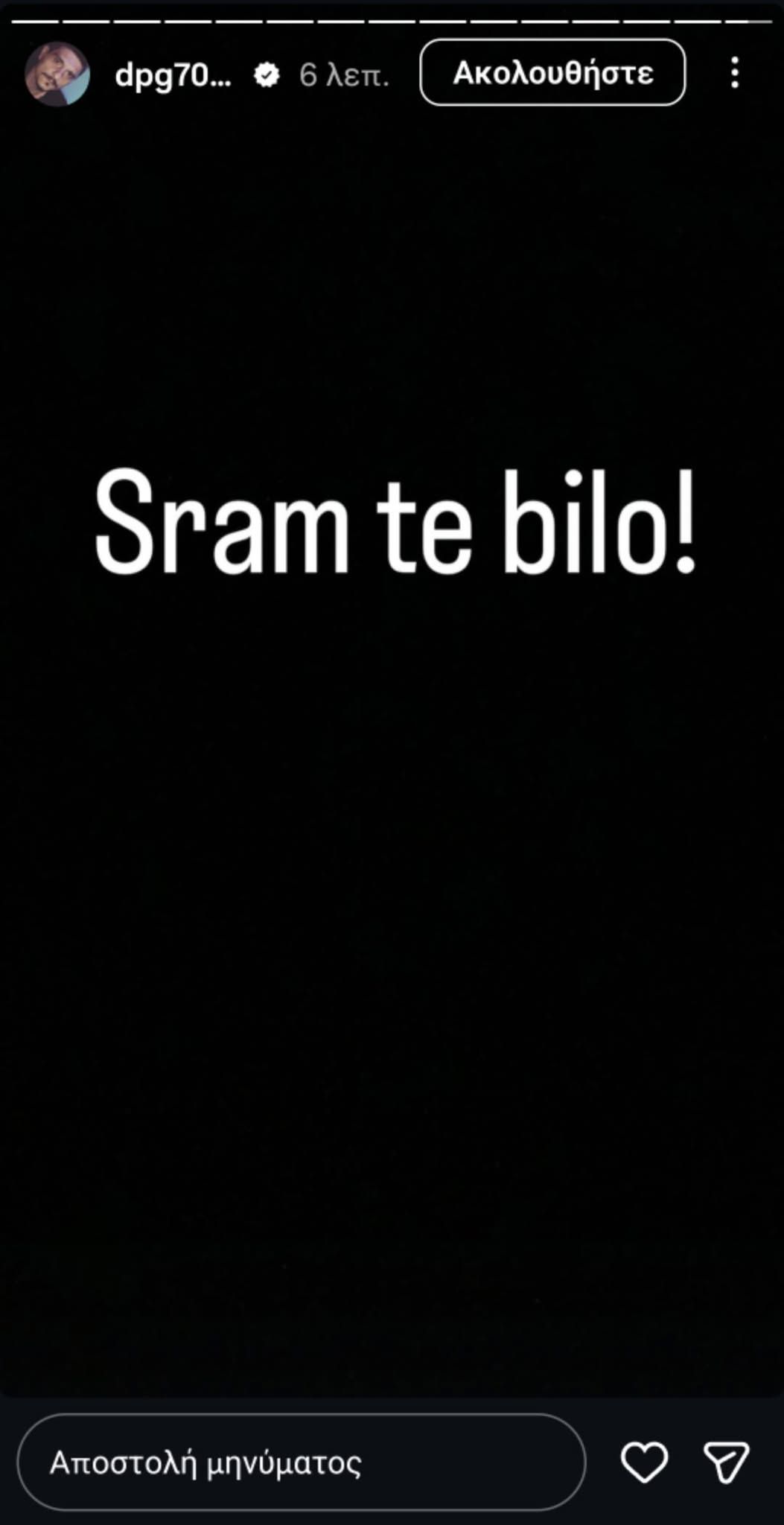 Την ώρα που η αναμέτρηση της 30ής αγωνιστικής της EuroLeague μεταξύ Ολυμπιακού και Παναθηναϊκού AKTOR βρισκόταν σε εξέλιξη στο Στάδιο Ειρήνης και Φιλίας, ο Δημήτρης Γιαννακόπουλος ανάρτησε story στο Instagram γράφοντας τη φράση «Sram te bilo!».