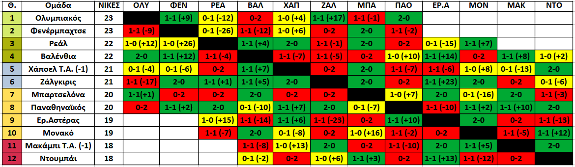Υπέρ: Χάποελ, Βαλένθια, Ρεάλ, Φενέρμπαχτσε (2-0)