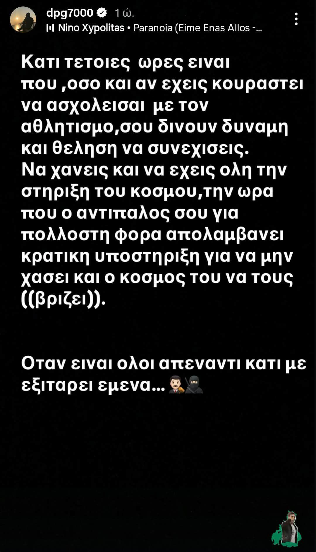 Συγκεκριμένα, ανέφερε: «Κάτι τέτοιες ώρες είναι που, όσο και αν έχεις κουραστεί να ασχολείσαι με τον αθλητισμό, σου δίνουν δύναμη και θέληση να συνεχίσεις. Να χάνεις και να έχεις όλη την στήριξη του κόσμου, την ώρα που ο αντίπαλός σου για πολλοστή φορά απολαμβάνει κρατική υποστήριξη για να μην χάσει και ο κόσμος του να τoυς βρίζει. Όταν είναι όλοι απέναντι, κάτι με εξιτάρει εμένα…».