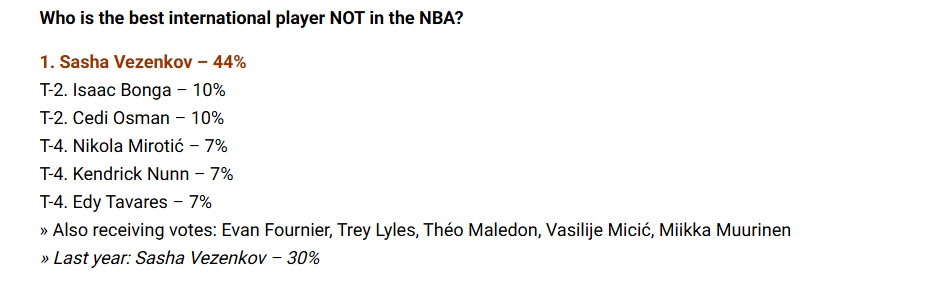 Ο Σάσα Βεζένκοφ αναδείχθηκε για δεύτερη διαδοχική χρονιά ως ο κορυφαίος παίκτης που αγωνίζεται εκτός του NBA, σύμφωνα με την καθιερωμένη ψηφοφορία των 30 General Managers του πρωταθλήματος.