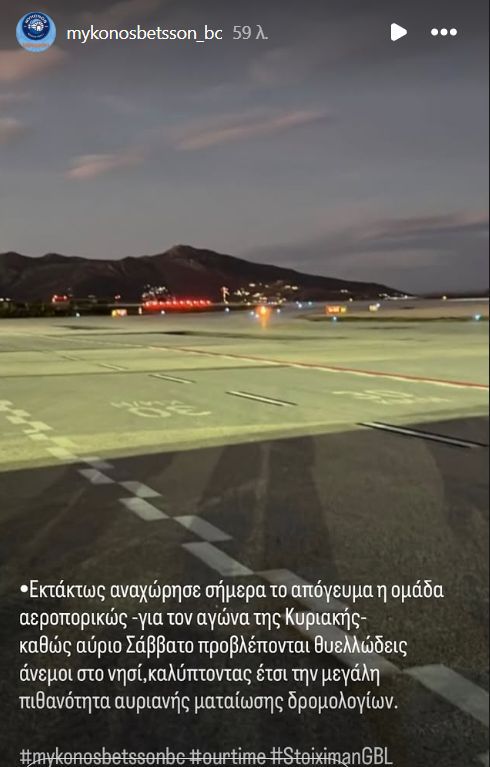 Η αποστολή της Μυκόνου αναγκάστηκε να φύγει πρόωρα από το νησί των ανέμων, από το βράδυ της Παρασκευής, λόγω των δυσμενών καιρικών συνθηκών που προβλέπονται για το Σάββατο, ώστε να προετοιμαστεί για τον αγώνα με την ΑΕΚ στη SUNEL Arena (Κυριακή 11/1, 13:00).