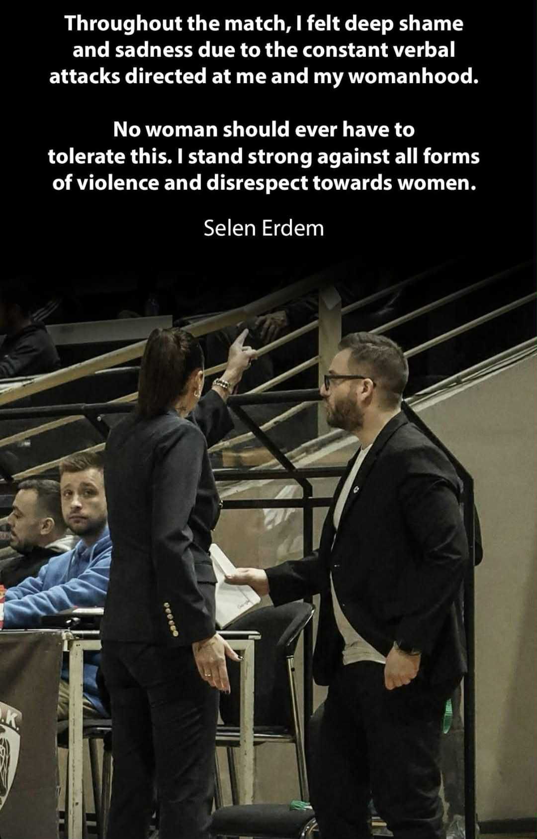 Παρόλα αυτά, η προπονήτρια των νικητών, Σελέν Ερντέμ, καταδίκασε την εις βάρος της φραστική επίθεση κατά τη διάρκεια του εν λόγω παιχνιδιού, από την κερκίδα. Συγκεκριμένα, σε story της στο Instagram έγραψε: