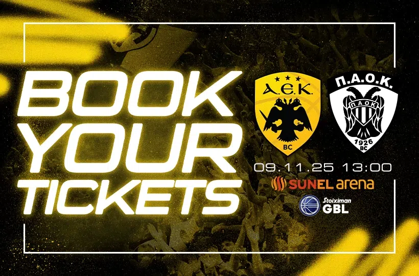 “Η ΑΕΚ BC ανακοινώνει, ότι ξεκίνησε η ηλεκτρονική διάθεση εισιτηρίων για την αναμέτρηση της «Βασίλισσας» με αντίπαλο τoν ΠΑΟΚ.Η αναμέτρηση θα διεξαχθεί στη SUNEL Arena, την Κυριακή 9 Νοεμβρίου 2025, στις 13:00, στο πλαίσιο της 6ης αγωνιστικής της Stoiximan GBL.