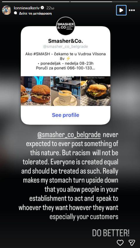 Ωστόσο, ο Γουόκερ απασχόλησε την επικαιρότητα για διαφορετικό λόγο. Ο Αμερικανός γκαρντ δημοσίευσε story στο Instagram, στο οποίο κατήγγειλε περιστατικό ρατσιστικής συμπεριφοράς σε κατάστημα burger στο Βελιγράδι, χωρίς να δώσει περισσότερες λεπτομέρειες για το συμβάν.