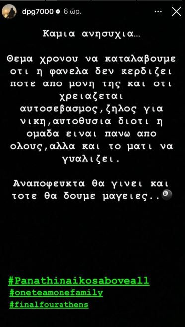 «Καμία ανησυχία... Θέμα χρόνου να καταλάβουμε ότι η φανέλα δεν κερδίζει ποτέ από μόνη της και ότι χρειάζεται αυτοσεβασμός, ζήλος για νίκη, αυτοθυσία διότι η ομάδα είναι πάνω απ' όλους, αλλά και το μάτι να γυαλίζει. Αναπόφευκτα θα γίνει και τότε θα δούμε μαγείες...»