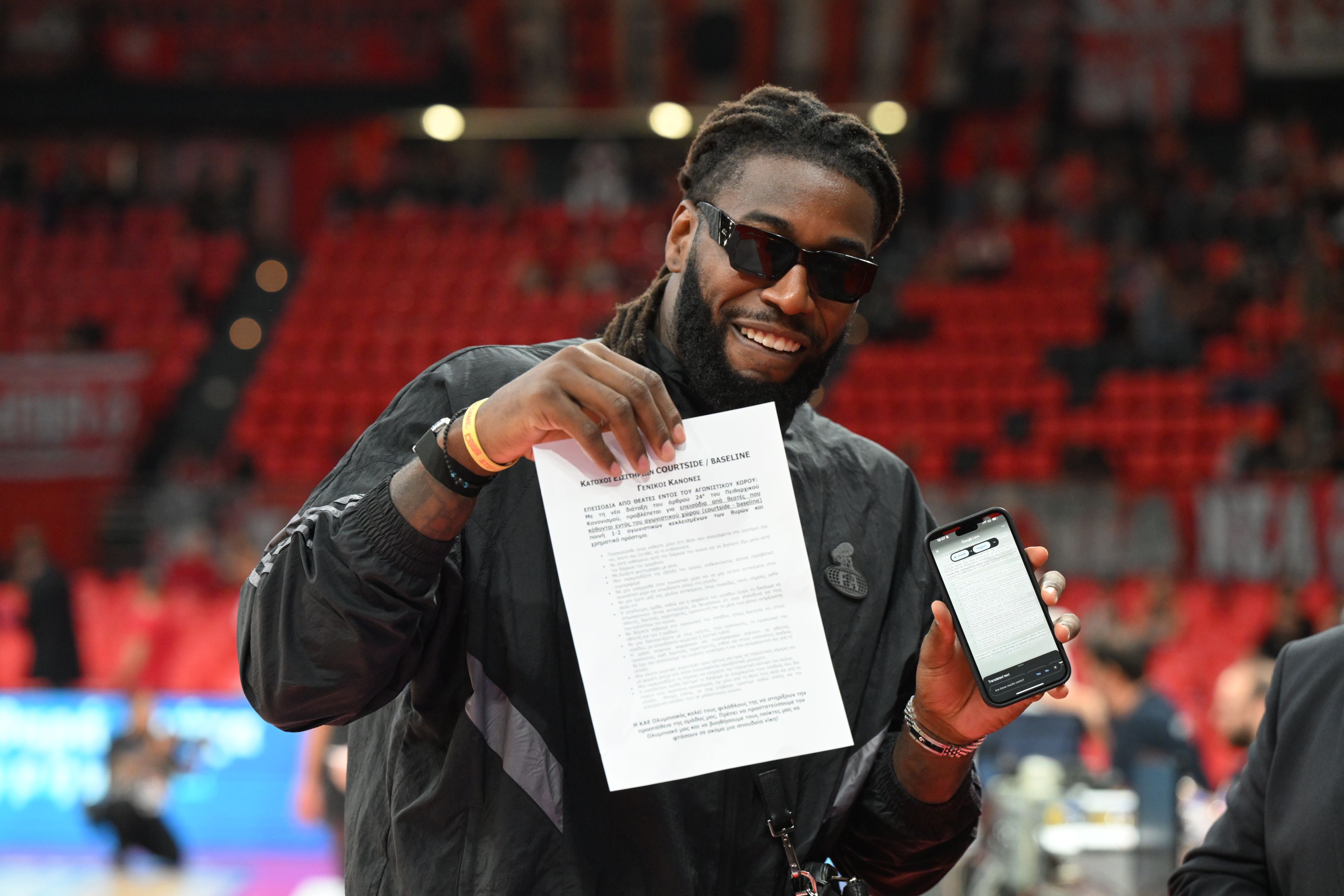 Ο σέντερ του Παναθηναϊκού, ο οποίος δεν αγωνίστηκε λόγω τραυματισμού, παρακολούθησε τον αγώνα από τις προνομιακές θέσεις δίπλα στο παρκέ. Το έγγραφο που έλαβε, με τίτλο «Κάτοχοι εισιτηρίων COURTSIDE / BASELINE - Γενικοί Κανόνες», περιείχε οδηγίες προς τους φιλάθλους για την αποφυγή παρεμπόδισης του αγώνα, ένα φαινόμενο που παρατηρείται συχνά σε αυτές τις θέσεις.