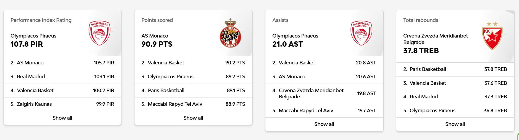 Παράλληλα, οι Πειραιώτες ξεχωρίζουν και σε άλλες στατιστικές κατηγορίες. Έχουν την 5η ομάδα καλύτερη ομάδα στα ριμπάουντ (36.8), με τον Νίκολα Μιλουτίνοφ να είναι πρώτος στην EuroLeague με 7.6 μέσον όρο, ενώ είναι στην πρώτη θέση σε ποσοστό ευστοχίας στα δίποντα. Αριθμούν 58.9%. Όλα αυτά έχουν κάνει τους παίκτες του Γιώργου Μπαρτζώκα να βρίσκονται στη 2η θέση της κατάταξης με ρεκόρ 16-9, έχοντας και ένα ματς λιγότερο στη διοργάνωση.