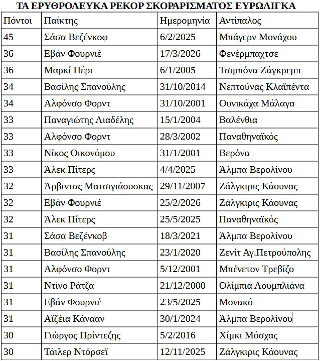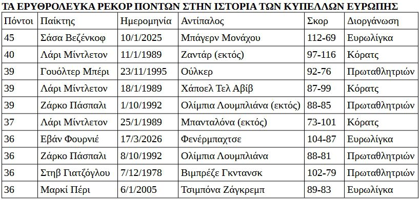 Κορυφαία επίδοση παραμένουν φυσικά οι 45 πόντοι του Σάσα Βεζένκοφ πριν 14 μήνες εναντίον της Μπάγερν στο ΣΕΦ ενώ 40 είχε βάλει ο Αμερικανός Λάρι Μίντλετον (δίδυμο τότε με τον θρυλικό Κάρι Σκάρι) τη σεζόν 1988-89 όταν έπαιζε μόνο στα Κύπελλα Ευρώπης εναντίον της Ζαντάρ στην Κροατία.