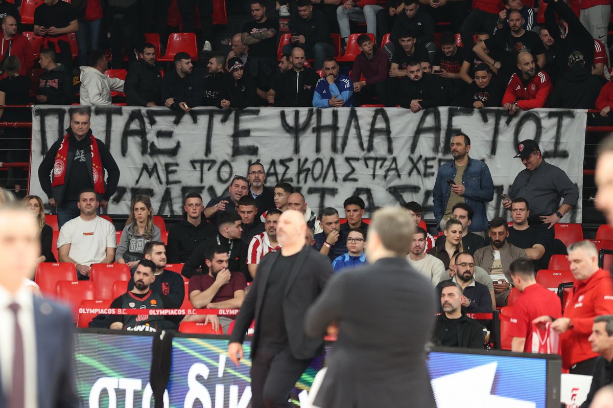 Συγκεκριμένα, το πανό που σήκωσαν οι οπαδοί του Ολυμπιακού γράφει τα εξής: «Πετάξτε ψηλά αετοί - Με το κασκόλ στα χέρια - Η τελευταία σας πνοή».