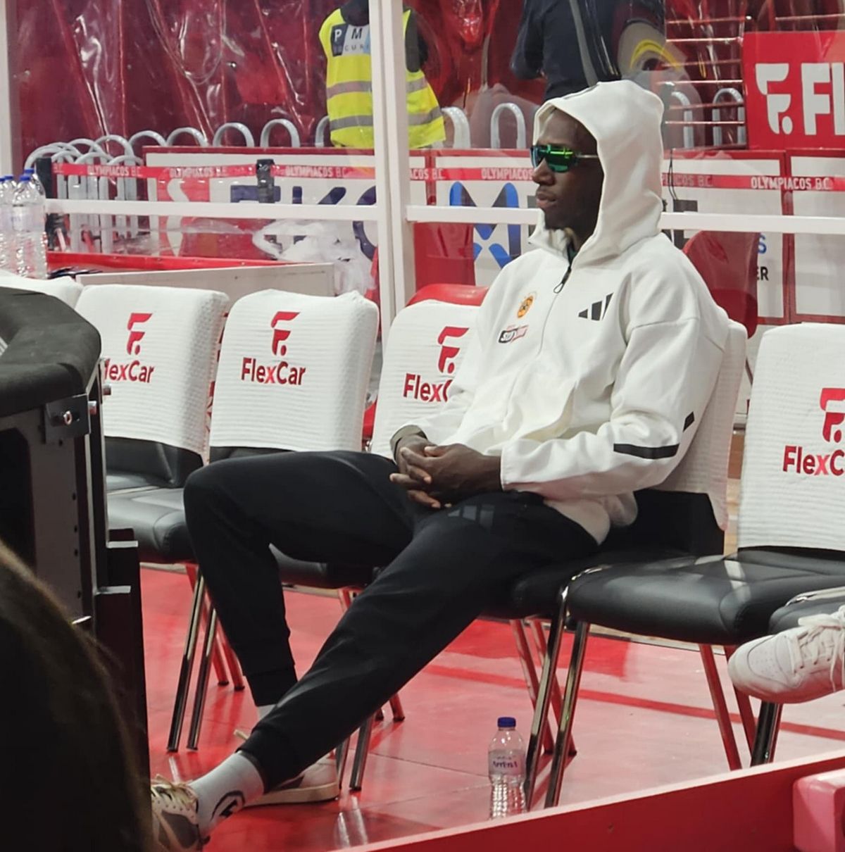 Ο Κέντρικ Ναν έμεινε εκτός δωδεκάδας, αλλά ακολούθησε την αποστολή στο ΣΕΦ - Έκατσε στον πάγκο της ομάδας του φορώντας κουκούλα και γυαλιά ηλίου.