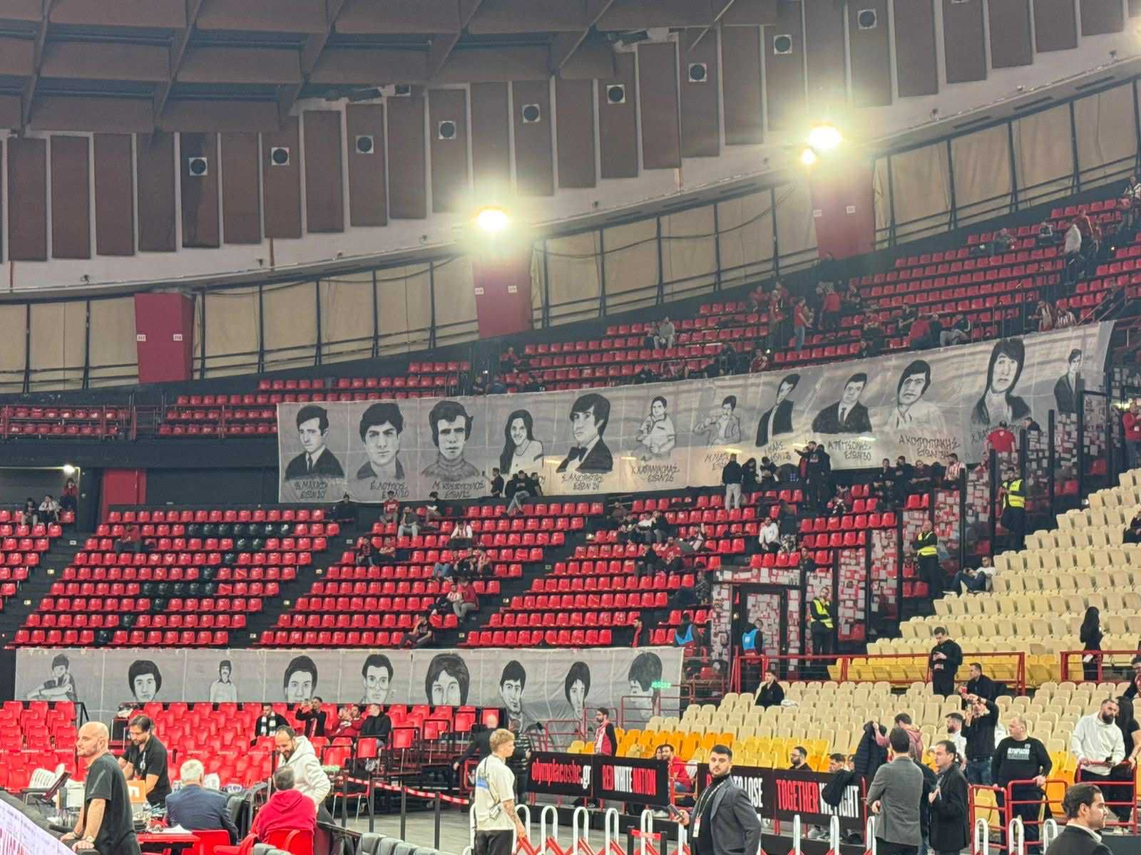 Οι φίλοι του Ολυμπιακού τίμησαν τη μνήμη των θυμάτων της τραγωδίας της Θύρας 7, αναρτώντας ένα πανό με τα πρόσωπά τους.