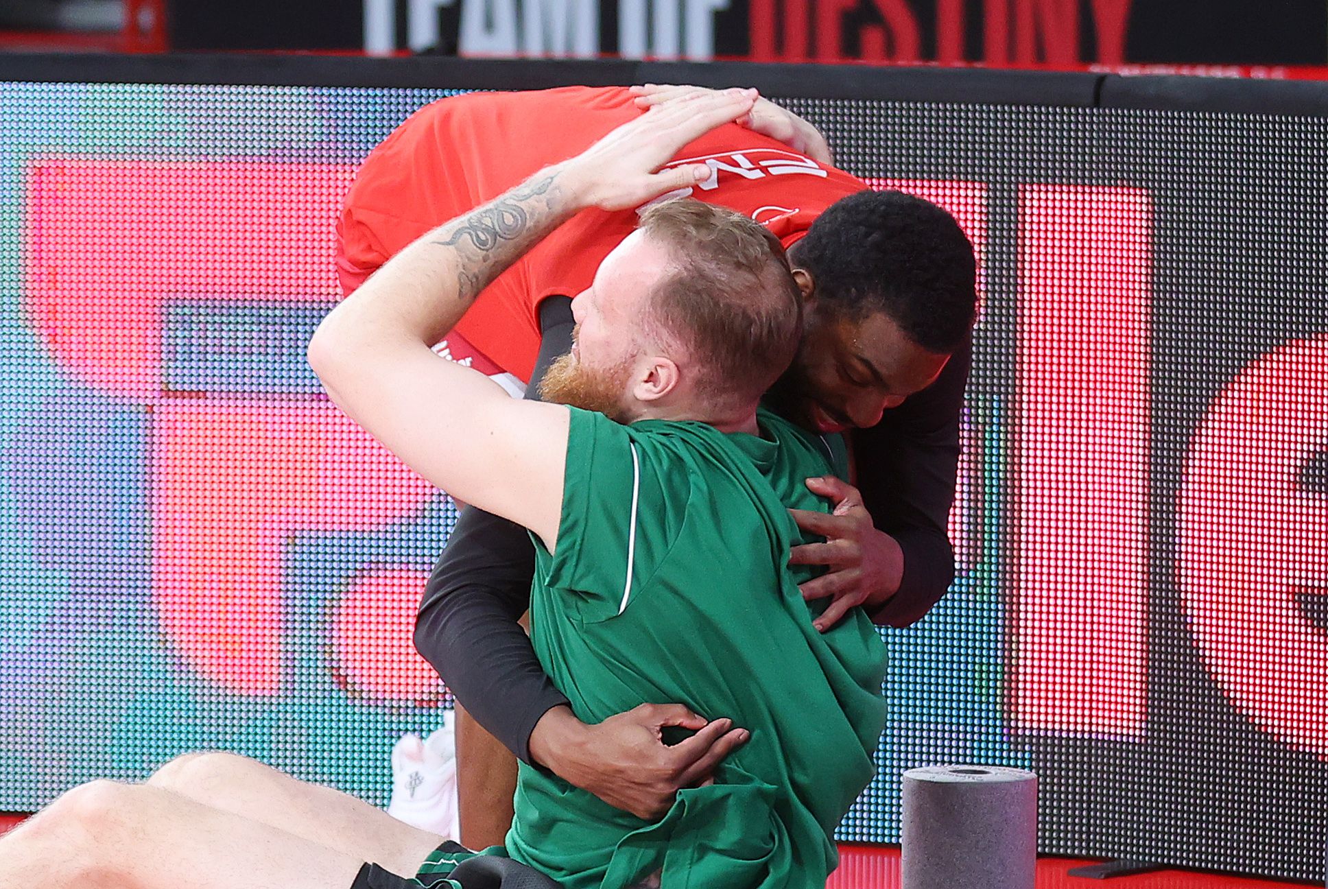 Λίγο πριν το τζάμπολ της αναμέτρησης, ο Κίναν Έβανς είχε θερμούς εναγκαλισμούς με πρώην συμπαίκτες και φίλους του στη Ζαλγκίρις, με τους οποίους βίωσε αρκετά πράγματα στο πέρασμά του από το Κάουνας.