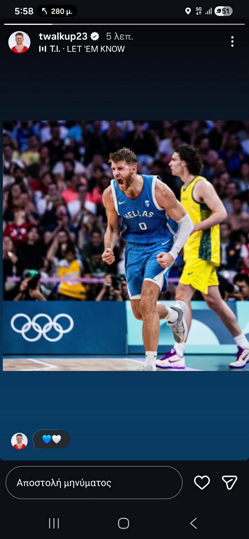 Το story του διεθνούς γκαρντ, όπου εμφανίζεται να πανηγυρίζει με τη φανέλα της Εθνική Ελλάδας στον αγώνα απέναντι στην Αυστραλία στους Ολυμπιακούς Αγώνες του 2024 ήταν η απάντηση του παίκτη στο κλίμα αμφισβήτησης που έχει δημιουργηθεί τις τελευταίες ημέρες.