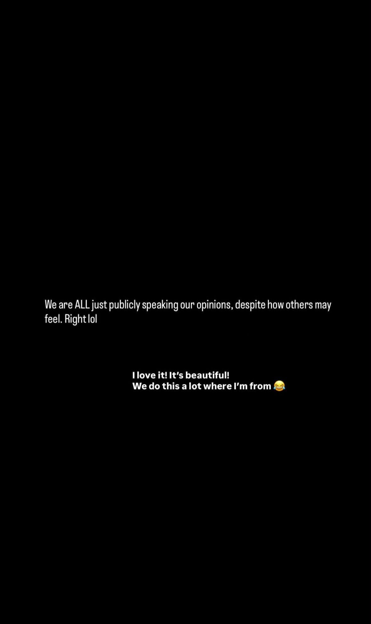 Λίγο αργότερα, η ίδια διέγραψε το εν λόγω στόρι και ανέβασε δύο νέα αναφέροντας: «Εκτός από τους φιλάθλους και το τρομερό προσωπικό της ομάδας, που έχω γνωρίσει. Όλοι απλώς λέμε τις απόψεις μας δημόσια, ανεξαρτήτως το πώς αισθάνονται οι άλλοι. Καλά, εντάξει. Το αγαπώ αυτό, είναι υπέροχο. Το κάνουμε αρκετά αυτό από εκεί που κατάγομαι!».