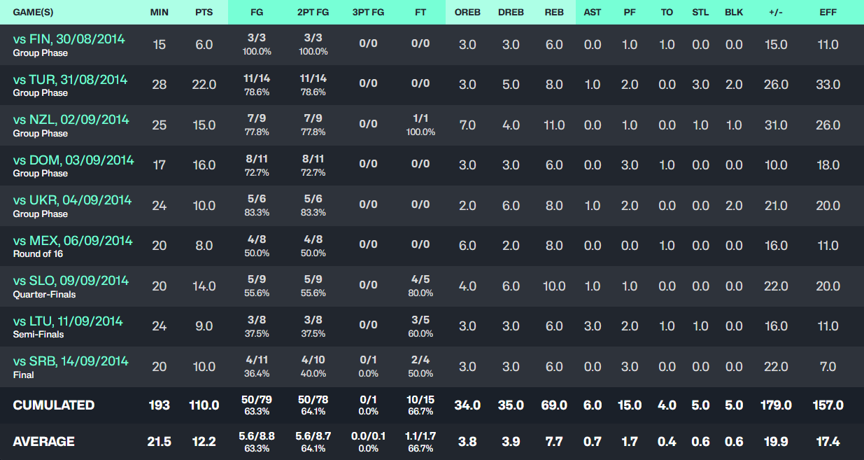 Το καλύτερό του παιχνίδι το έκανε στη δεύτερη αγωνιστική κόντρα στην Τουρκία, όπου σε 28' είχε 22 πόντους με 11/14 δίποντα, 8 ριμπάουντ, μία ασίστ, τρία κλεψίματα και δύο τάπες και συνολικά 33 ολάκερους βαθμούς στη efficiency. Στο τελικό με τη Σερβία δε, είχε σε 20' από 10 πόντους, 6 ριμπάουντ και 22 στο plus/minus.
