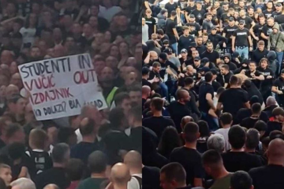 Ένα πανό κατά του προέδρου της Σερβίας, Αλεξάνταρ Βούτσιτς, πυροδότησε βίαιες συγκρούσεις μεταξύ οπαδών της Παρτιζάν κατά τη διάρκεια του αγώνα με την Παρί για την Euroleague.