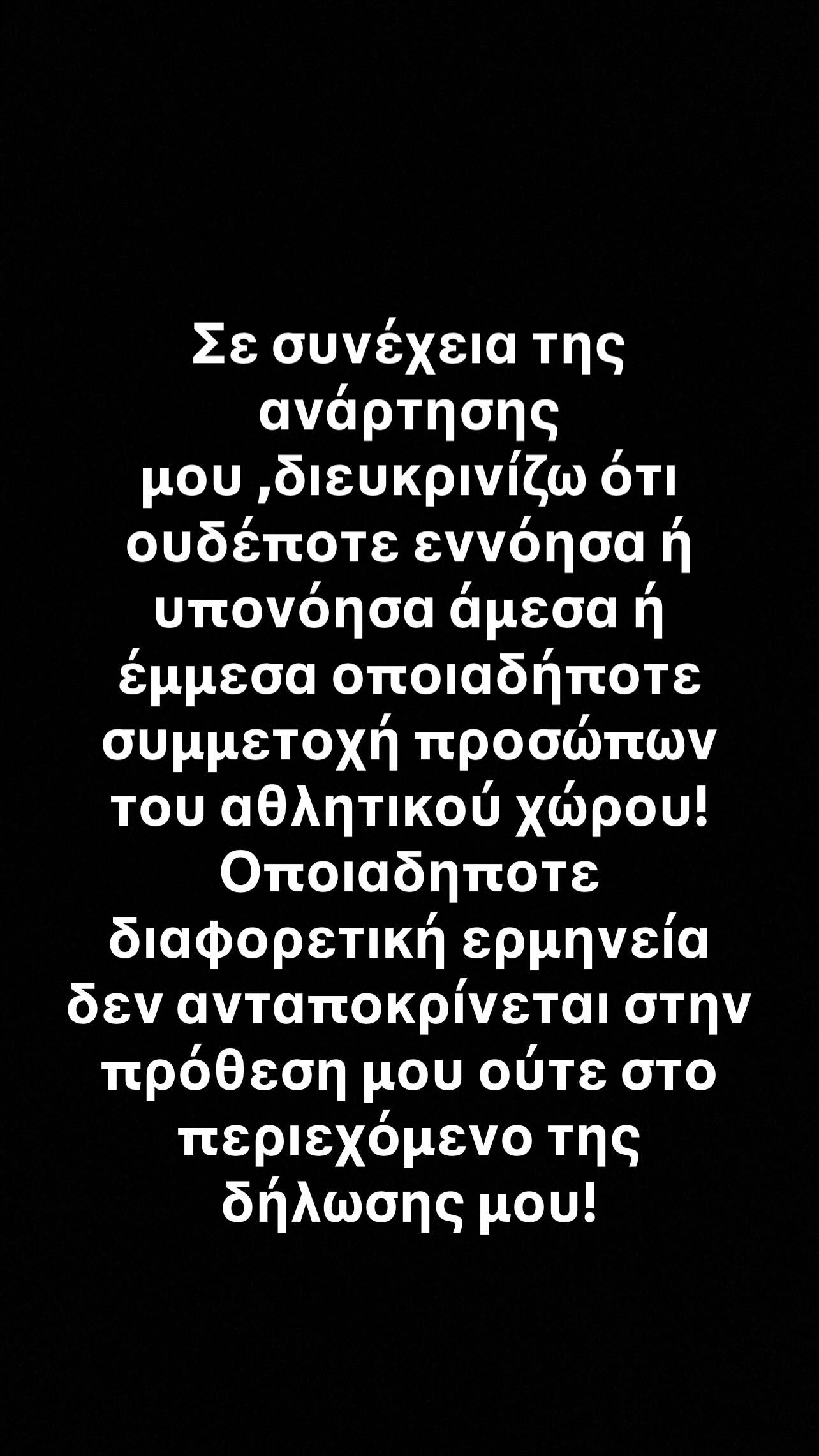 Αυτό, συγκεκριμένα αναφέρει: «Σε συνέχεια της ανάρτησης μου, διευκρινίζω ότι ουδέποτε εννόησα ή υπονόησα άμεσα ή έμμεσα οποιαδήποτε συμμετοχή προσώπων του αθλητικού χώρου! Οποιαδήποτε διαφορετική ερμηνεία δεν ανταποκρίνεται στην πρόθεσή μου ούτε στο περιεχόμενο της δήλωσής μου!».