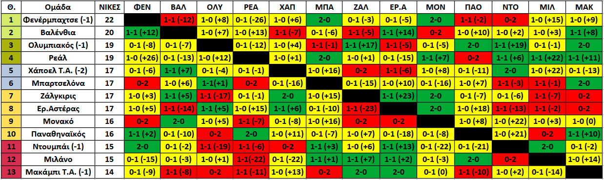 Αριστερά οι ομάδες (σε παρένθεση τα λιγότερα παιχνίδια όπου υπάρχουν), μετά οι νίκες και στη συνέχεια: Σε πράσινο φόντο οι αντίπαλοι στους οποίους οι ομάδες εξ αριστερών υπερισχύουν αυτές εξ δεξιών. Αντίστοιχα σε κόκκινο φόντο οι ομάδες με τις οποίες κάθε αντίπαλος υστερεί σε ισοβαθμία. Αυτά τα δύο χρώματα χρησιμοποιούνται για “ζευγάρια” που έχουν ολοκληρώσει τις μεταξύ τους αναμετρήσεις. Σε κίτρινο, δε, φόντο οι έως τώρα ισοβαθμίες με τα ζευγάρια που έχουν εκκρεμότητα ένα μεταξύ τους παιχνίδι ενώ μέσα στο κάθε “κουτάκι” αναφέρεται η έως τώρα ισορροπία του ζευγαριού. Για παράδειγμα στην ισοβαθμία Φενέρμπαχτσε-Ολυμπιακός η Φενέρ έχει νικήσει στο πρώτο μεταξύ τους παιχνίδι με 8 πόντους διαφορά.