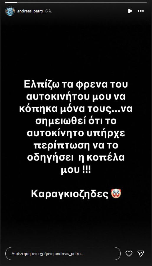 Αναλυτικά, η ανάρτησή του έγραφε: «Ελπίζω τα φρένα του αυτοκινήτου μου να κόπηκαν μόνα τους... Να σημειωθεί ότι το αυτοκίνητο υπήρχε περίπτωση να το οδηγήσει η κοπέλα μου! Καραγκιόζηδες».