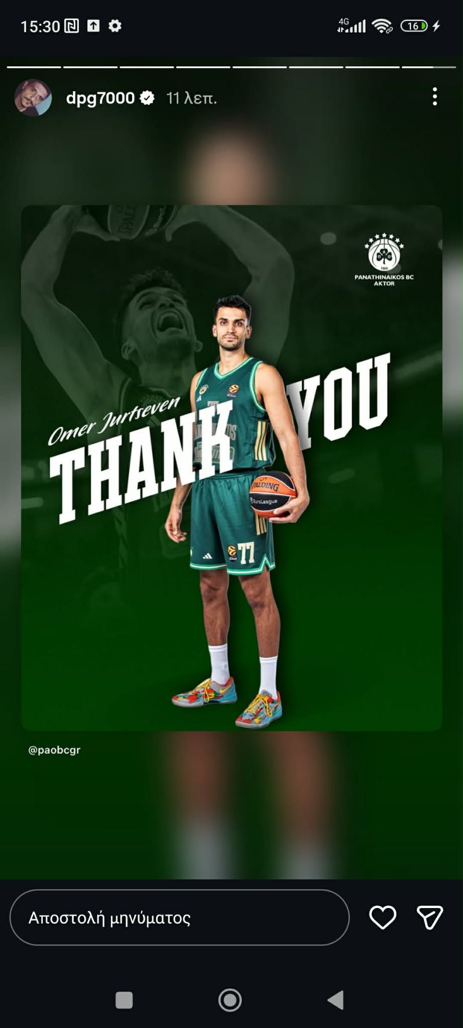 Για τον λόγο αυτό πόσταρε στον προσωπικό του λογαριασμό το ευχαριστώ της ΚΑΕ στον Τούρκο σέντερ.