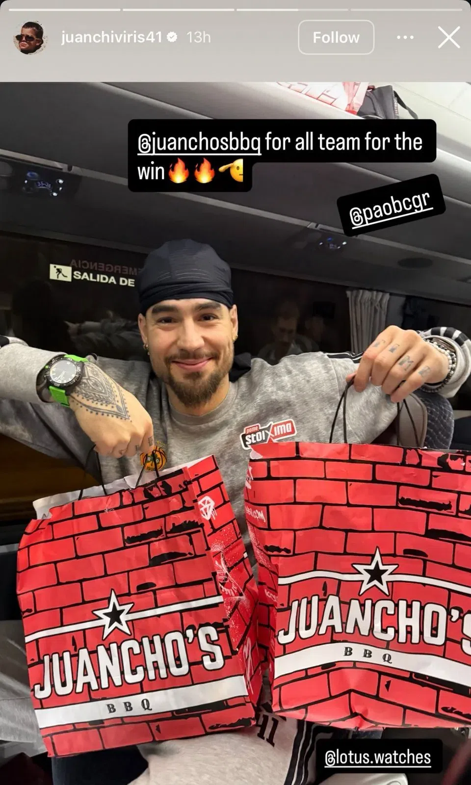 Συγκεκριμένα, ο Ερνανγκόμεθ, ο οποίος διατηρεί στην Ισπανία την αλυσίδα εστιατορίων γρήγορου φαγητού «Juancho’s BBQ», παρήγγειλε γεύματα για όλη την ομάδα. Η κίνησή του αυτή πρόσθεσε μια ευχάριστη νότα στην αποστολή λίγο πριν την αναχώρησή της για την Αθήνα, κλείνοντας με τον καλύτερο τρόπο την επιτυχημένη βραδιά στη Μαδρίτη.