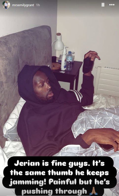 «Ο Τζέριαν είναι καλά παιδιά. Είναι ο ίδιος αντίχειρας που χτυπάει συνέχεια! Πονάει, αλλά το παλεύει», έγραψε χαρακτηριστικά η Έμιλι Γκραντ, δημοσιεύοντας μια φωτογραφία όπου το χέρι του παίκτη φαίνεται δεμένο για προστασία.