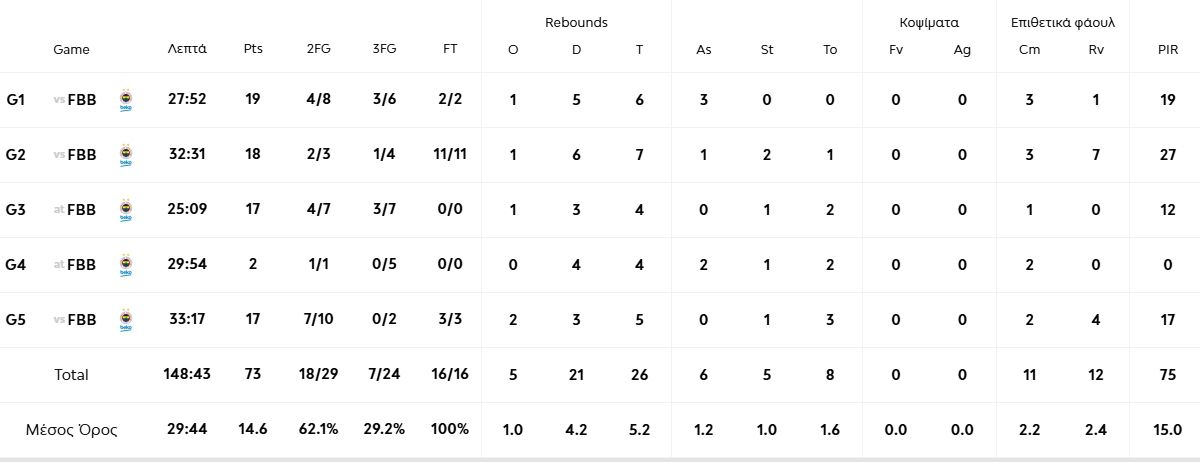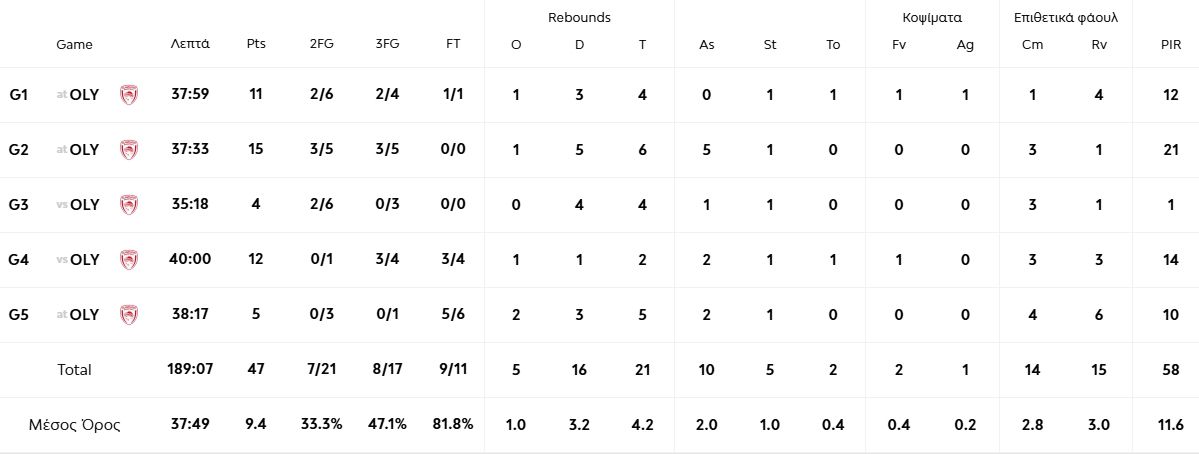 Ολοκλήρωσε τη σειρά κόντρα στον Ολυμπιακό με 9.4 πόντους, 47.1% στο τρίποντο, 4.2 ριμπάουντ και 2.0 ασίστ μέσο όρο, αγωνιζόμενος για 37.4 (!) λεπτά ανά παιχνίδι. Αξιοσημείωτο είναι το γεγονός πως στο Game 4 έμεινε στο παρκέ και τα 40 λεπτά, αποτυπώνοντας τη σημασία του ρόλου του στη λειτουργία της ομάδας του.