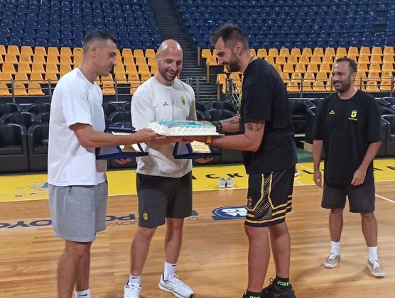 Mε μια τούρτα καλωσόρισε η ΚΑΕ Άρης τους Νίκο Ζήση και Αλέξανδρο Μπουντοβίνο στο Nick Galis Hall, μετά την κατάκτηση του χάλκινου μεταλλίου στο Eurobasket 2025.