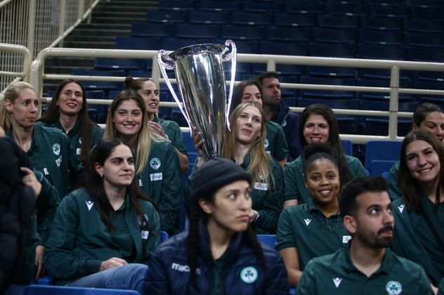 Στις κερκίδες του ΟΑΚΑ βρέθηκε η γυναικεία ομάδα του Παναθηναϊκού με το Κύπελλο Ελλάδος της περιόδου 2022-2023 που είχε κερδίσει στο κλειστό της Ζοφριάς το απόγευμα της Κυριακής (26/3) και έγινε δεκτή με ζεστό χειροκρότημα.