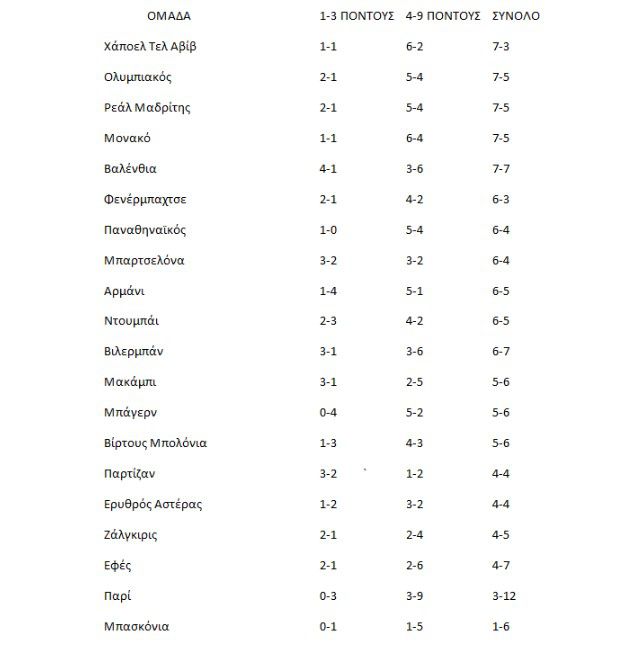 Στο σύνολο πάντως των μονοψήφιων αγώνων η Χαποέλ Τελ Αβίβ έχει τα πρωτεία με ποσοστό νικών 70%(7 νικες-3 ήττες) ενώ απίθανη είναι η επίδοση της Παρί. 15 από τα 20 παιχνίδια της έχουν κριθεί με μονοψήφια διαφορά πόντων (τα περισσότερα από κάθε άλλη ομάδα) αλλά έχει κατορθώσει να κερδίσει σε μόλις τρία από αυτά! Κάτι ανάλογο είναι και το….κατόρθωμα της Μπασκόνια. Είναι η ομάδα που έχει παίξει τα λιγότερα μονοψήφια παιχνίδια (μόλις 7) και έχει κερδίσει μόνο σε ένα!