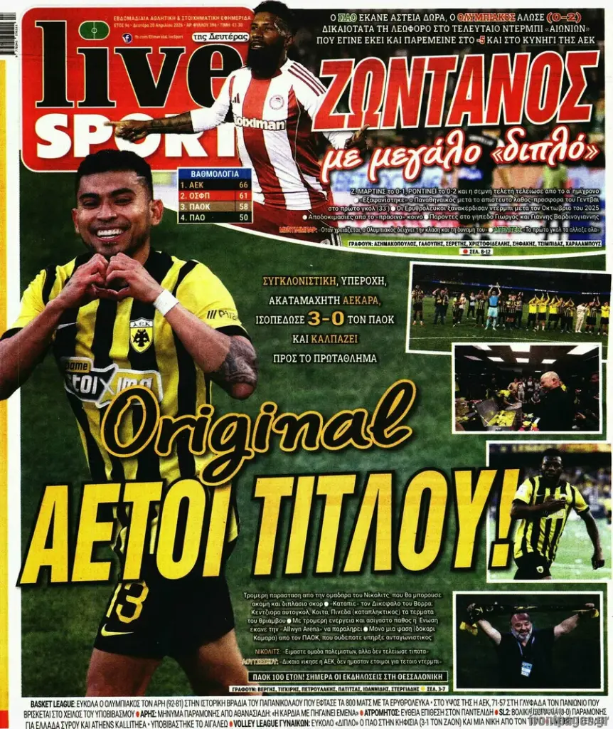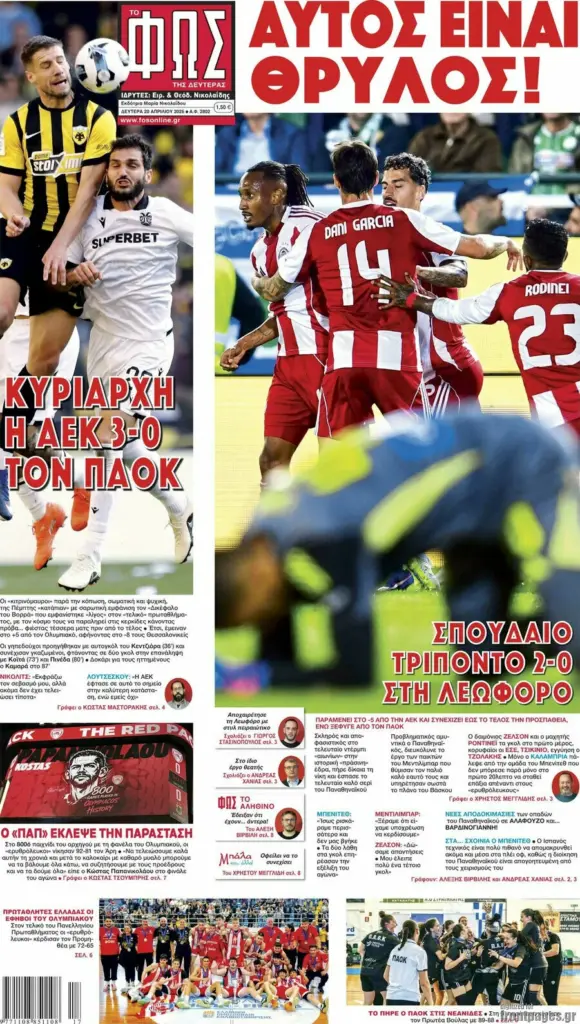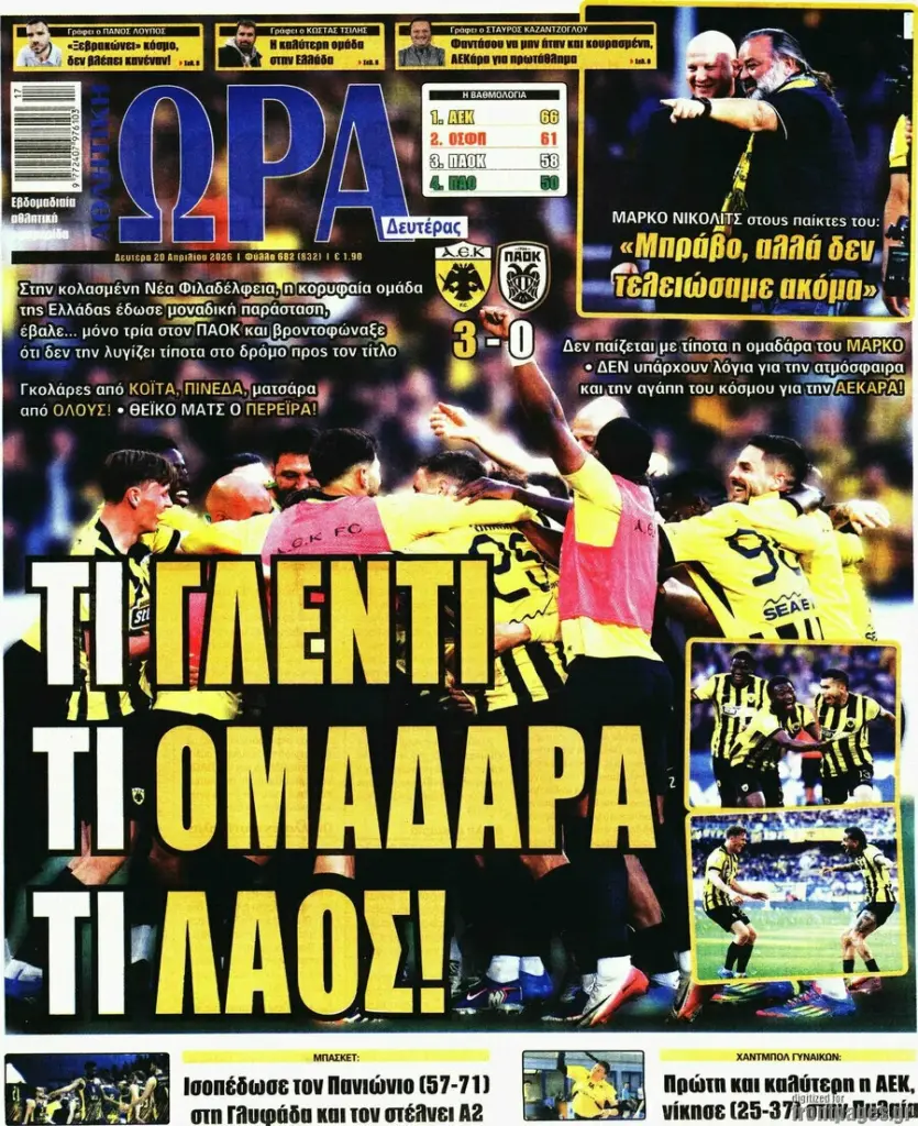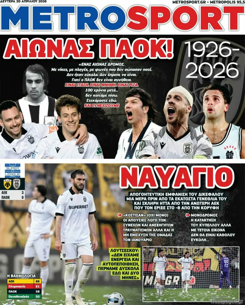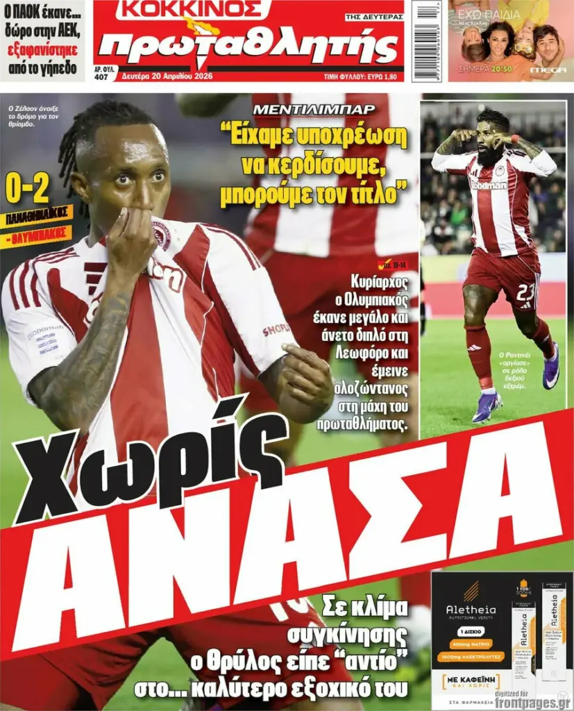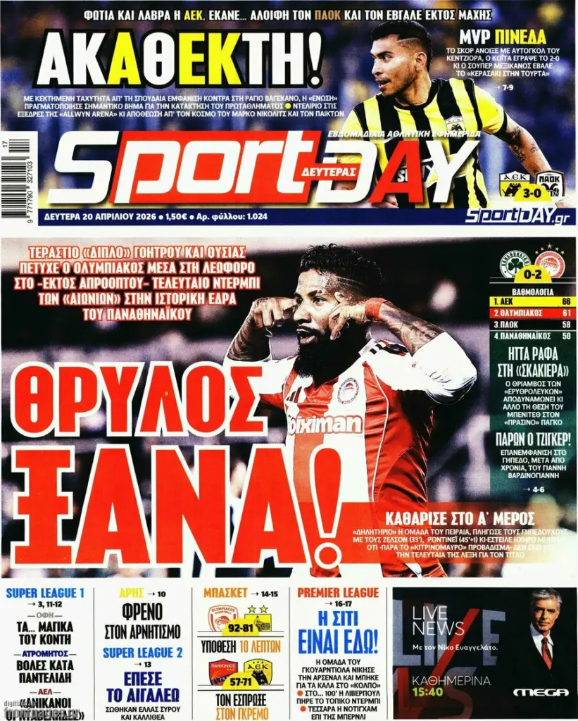 ΕΠΙΚΑΙΡΌΤΗΤΑ ΠΡΩΤΟΣΕΛΙΔΑ ΣΗΜΕΡΑ (20/04): «ORIGINAL ΑΕΤΟΙ ΤΙΤΛΟΥ – ΑΥΤΟΣ ΕΙΝΑΙ ΘΡΥΛΟΣ!» Πρωτοσέλιδα σήμερα (20/04): «Original αετοί τίτλου – Αυτός είναι Θρύλος!» Τα σημερινά (19/1) πρωτοσέλιδα των αθλητικών εφημερίδων Sportal Newsroom 07:49 - 20.04.2026 Δείτε τα πρωτοσέλιδα των αθλητικών εφημερίδων της Δευτέρας (20/04). Ακολουθήστε το SPORTAL στο Google News για να μαθαίνετε όλα τα αθλητικά νέα Ακολουθήστε το SPORTAL στο WhatsApp και γίνετε μέλος της αθλητικής κοινότητας