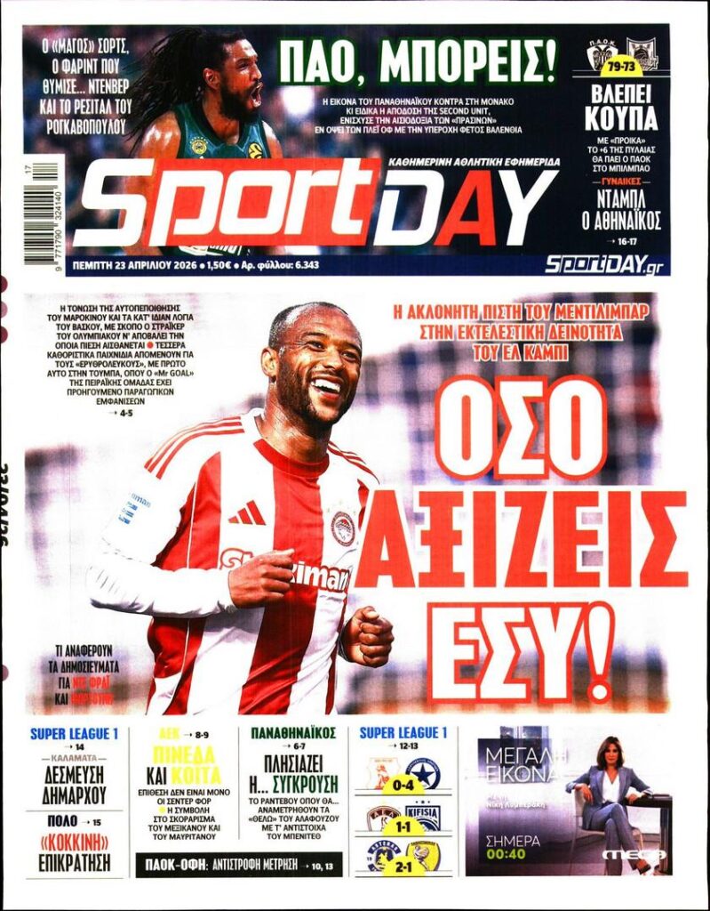 ΕΠΙΚΑΙΡΌΤΗΤΑ ΠΡΩΤΟΣΕΛΙΔΑ ΣΗΜΕΡΑ (22/04): «Η ΑΕΚ ΕΤΟΙΜΑΖΕΙ ΤΗΝ ΠΡΟΤΑΣΗ ΓΙΑ ΤΟΝ ΠΙΝΕΔΑ – ΑΓΚΑΛΙΑ ΜΕ ΜΙΛΕΡ-ΜΑΚ ΙΝΤΑΙΡ » Πρωτοσέλιδα σήμερα (22/04): «Η ΑΕΚ ετοιμάζει την πρόταση για τον Πινέδα – Αγκαλιά με Μίλερ-Μακ Ιντάιρ » Τα σημερινά (10/4) πρωτοσέλιδα των αθλητικών εφημερίδων Sportal Newsroom 07:40 - 23.04.2026 Δείτε τα πρωτοσέλιδα των αθλητικών εφημερίδων της Πέμπτης (23/04). Εφημερίδες Ακολουθήστε το Sportal.gr στο Google News για να μαθαίνετε όλα τα αθλητικά νέα Ακολουθήστε το Sportal.gr στο WhatsApp και γίνετε μέλος της αθλητικής κοινότητας