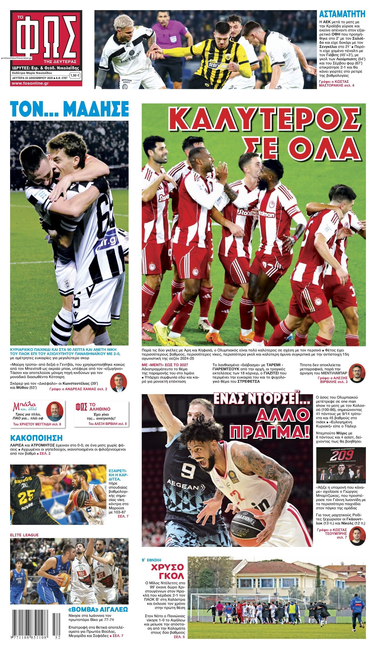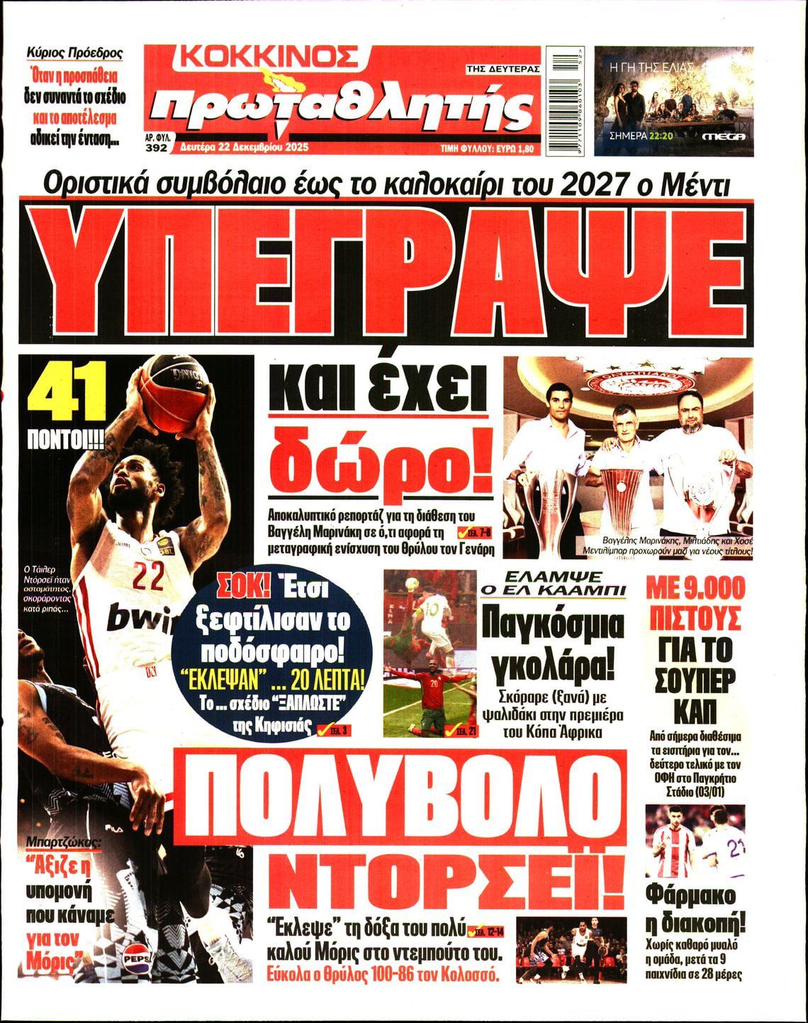 Άλλη μια καινούργια εβδομάδα ξεκινά σήμερα, Δευτέρα 22 Δεκεμβρίου, με τον ελληνικό αθλητικό Τύπο να σχολιάζει όλα όσα συνέβησαν την Κυριακή (21/12). Αρχικά, λόγος γίνεται για την ανανέωση του Χοσέ Λουίς Μεντιλίμπαρ στον Ολυμπιακό μέχρι το 2027, αλλά και το... δώρο που ακολουθεί.