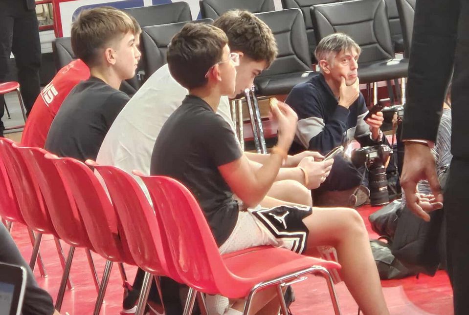 Οι τρεις γιοι του Βασίλη Σπανούλη, Θανάσης, Βασίλης και Δημήτρης, έχουν πάρει από νωρίς πρώτη θέση στο ΣΕΦ για να δουν από κοντά τον αγώνα Ολυμπιακός-Μονακό.
