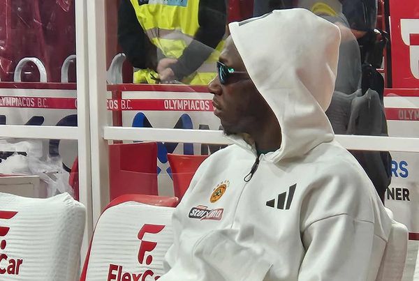 Ο Κέντρικ Ναν έμεινε εκτός δωδεκάδας, αλλά ακολούθησε την αποστολή στο ΣΕΦ - Έκατσε στον πάγκο της ομάδας του φορώντας κουκούλα και γυαλιά ηλίου.