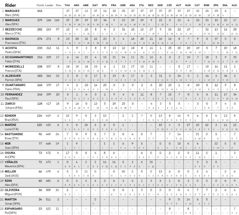 Δείτε τους πίνακες βαθμολογίας για αναβάτες και ομάδες στο φετινό πρωτάθλημα του MotoGP, έπειτα από τον θρίαμβο του Ραούλ Φερνάντεθ στο GP της Αυστραλίας.