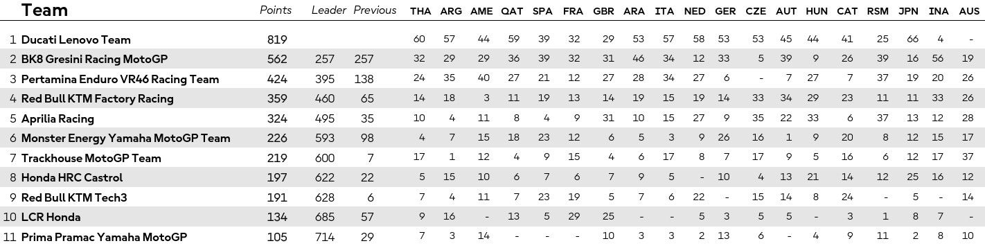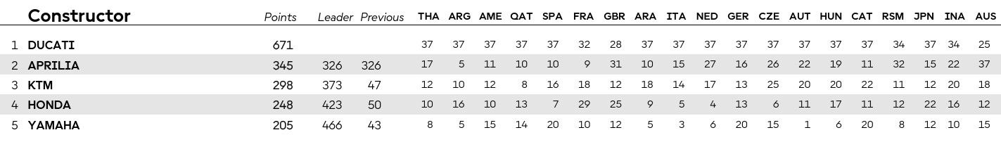 Στους κατασκευαστές, η Ducati έχει εξασφαλίσει τον τίτλο από το αγωνιστικό τριήμερο στη Βαρκελώνη. Στη δεύτερη θέση της κατάταξης βρίσκεται η Aprilia, η οποία άνοιξε τη διαφορά της από την τρίτη KTM χάρη στη νίκη του Ραούλ Φερνάντεθ, αλλά και στο βάθρο του Μπετζέκι. Honda και Yamaha ακολουθούν στην 4η και 5η θέση αντίστοιχα.