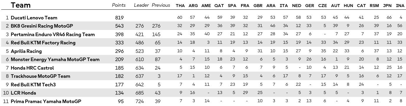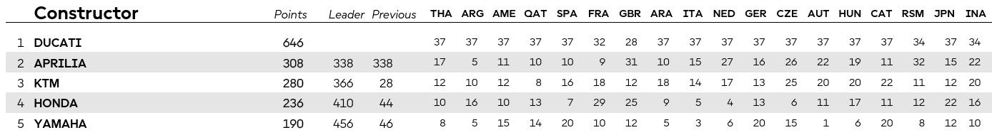 Στο πρωτάθλημα των κατασκευαστών η εργοστασιακή Ducati Lenovo εξασφάλισε τον τίτλο των ομάδων από το Σπριντ του Σαββάτου (04/10), παρότι δεν συγκέντρωσε βαθμούς στον σημερινό αγώνα.