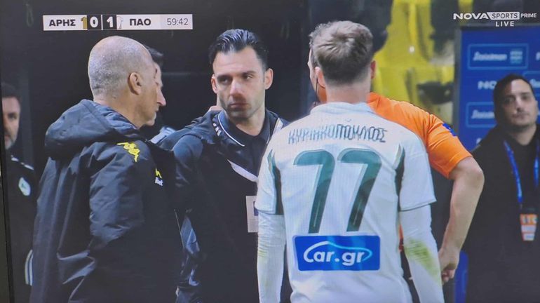 Αμέσως μετά την κόκκινη κάρτα, το στέλεχος των «πράσινων» κατευθύνθηκε στον πάγκο και έκατσε για λίγο σε αυτόν. Ωστόσο μετά από συστάσεις του ρέφερι, τελικά εκείνος και ο Τάσος Μουρατίδης αποχώρησαν παρέα για την κερκίδα.