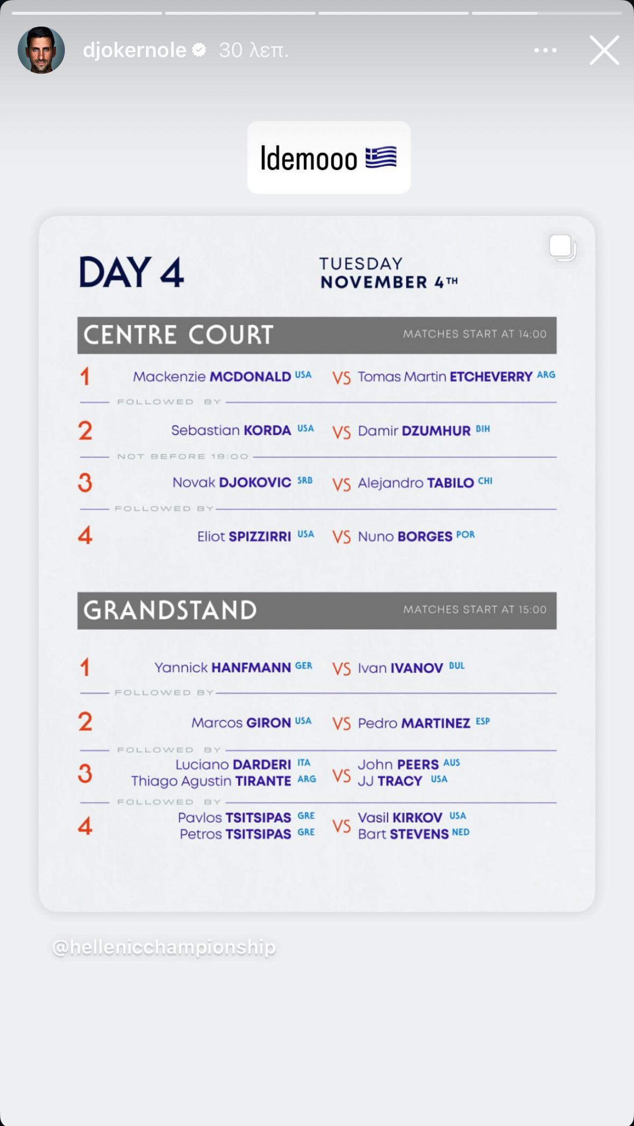 Στην ανάρτησή του, ο 38χρονος τενίστας κάλεσε τον κόσμο της Αθήνας να γεμίσει τις κερκίδες του Telekom Center Athens, συνοδεύοντας το μήνυμά του με τη χαρακτηριστική σερβική λέξη «Idemo», που μεταφράζεται ως «Πάμε».