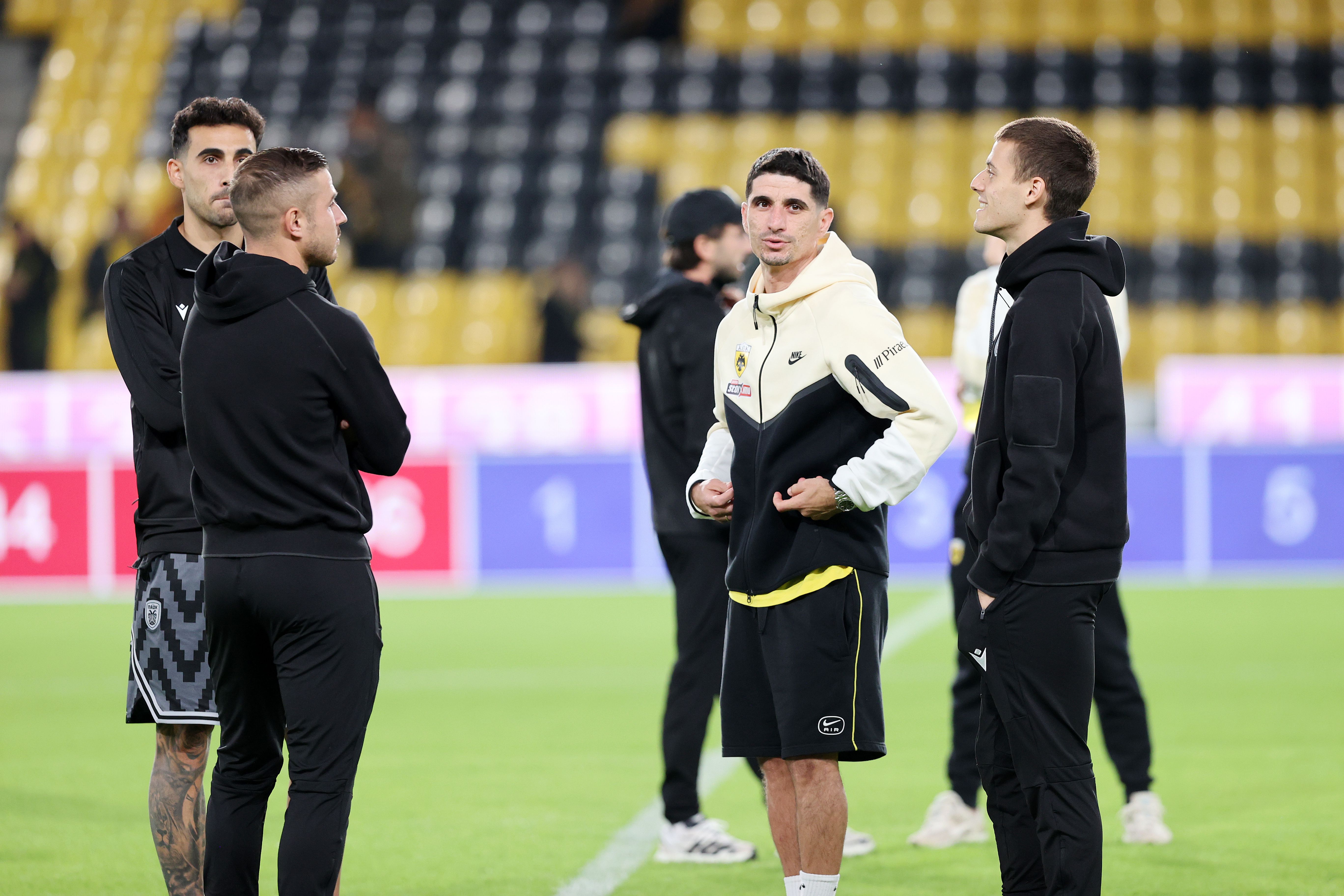 Λίγο πριν την έναρξη της αναμέτρησης ανάμεσα στην ΑΕΚ και τον ΠΑΟΚ στη Νέα Φιλαδέλφεια, για την 7η αγωνιστική της Super League, οι παίκτες και τα τεχνικά επιτελεία των δύο ομάδων είχαν την ευκαιρία για σύντομες συνομιλίες στον αγωνιστικό χώρο.