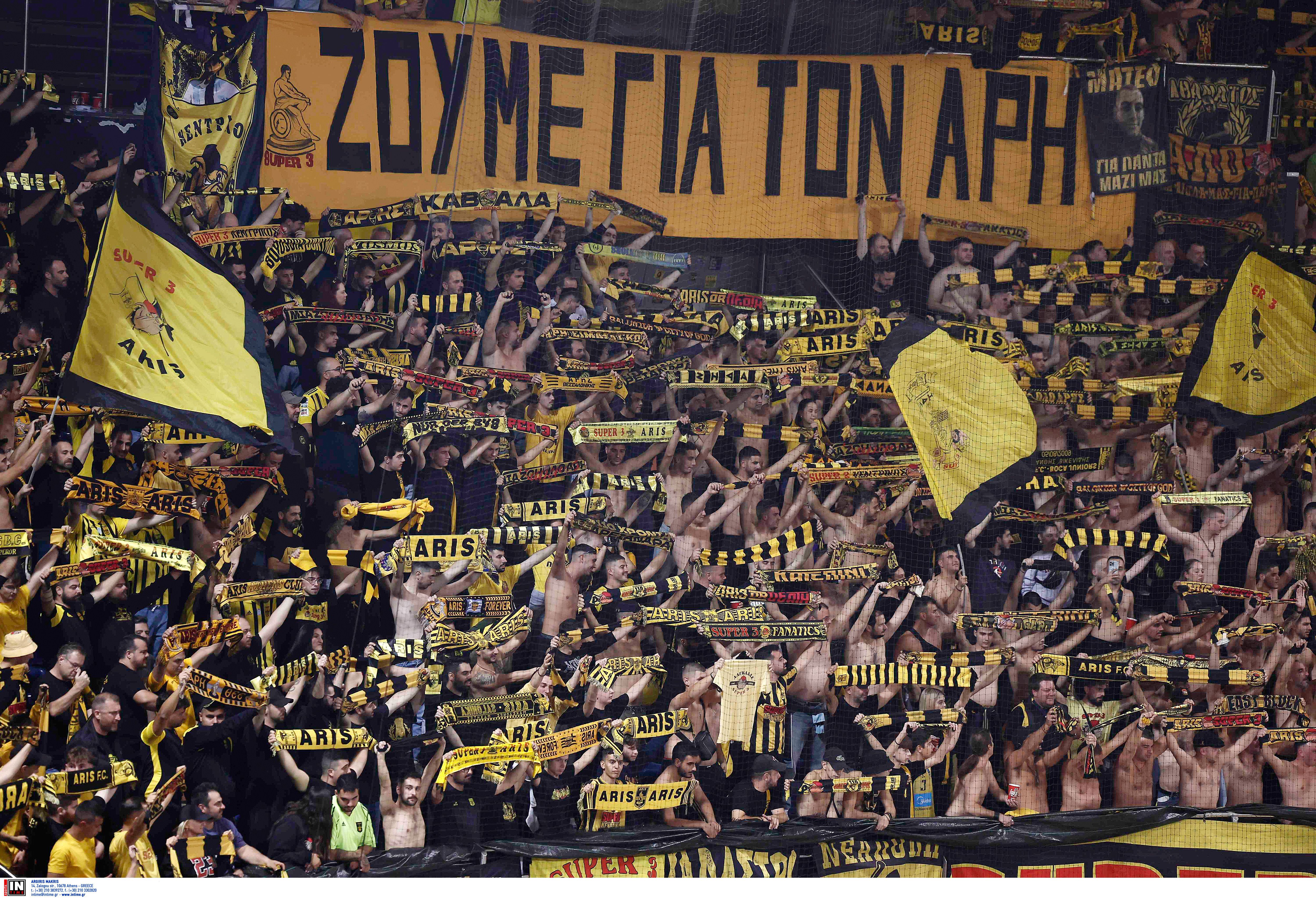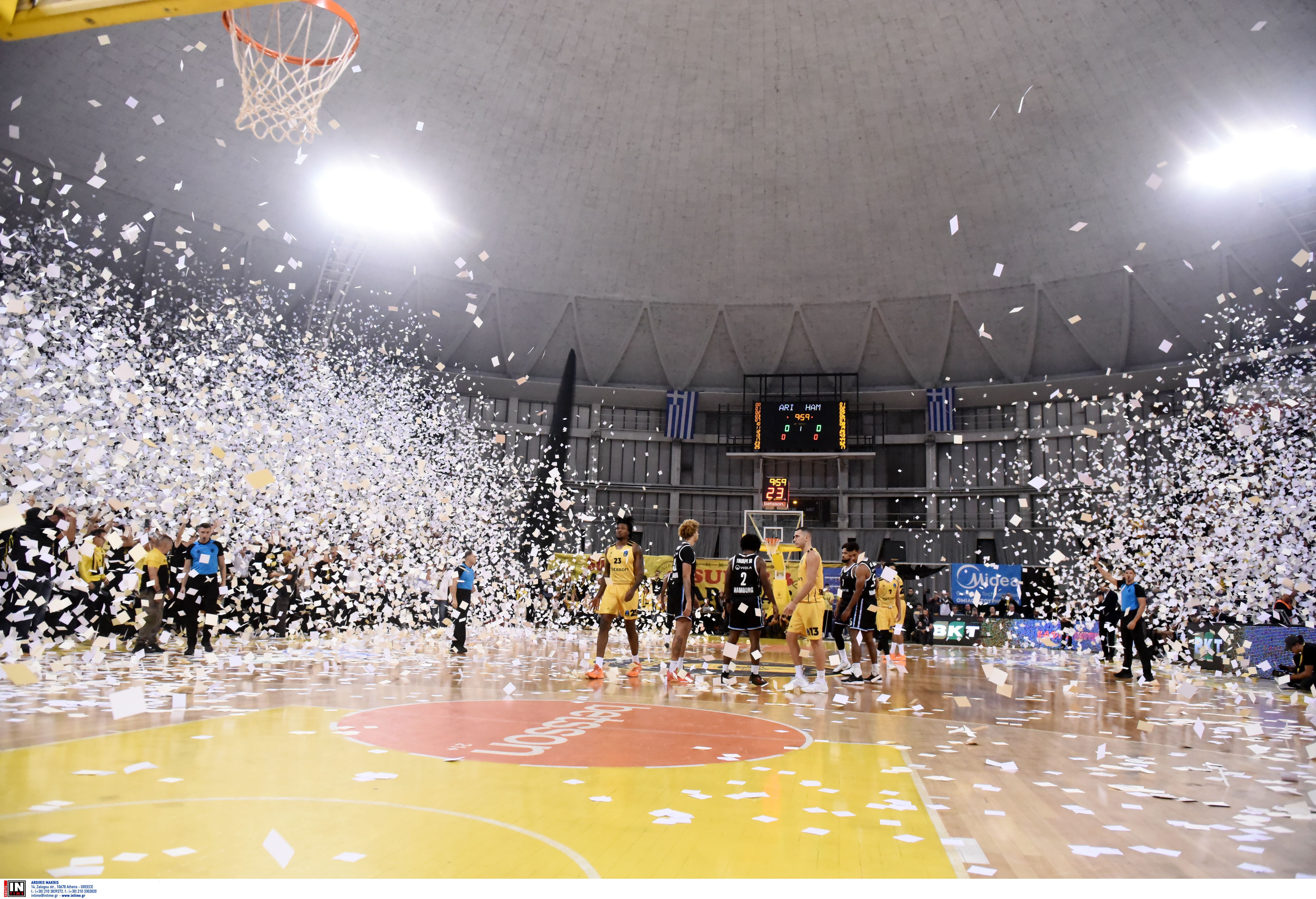 Και φυσικά, το καθιερωμένο σόου των οπαδών του Άρη με τα χαρτάκια! Θα περιμένουμε λίγο για να καθαριστεί το παρκέ.