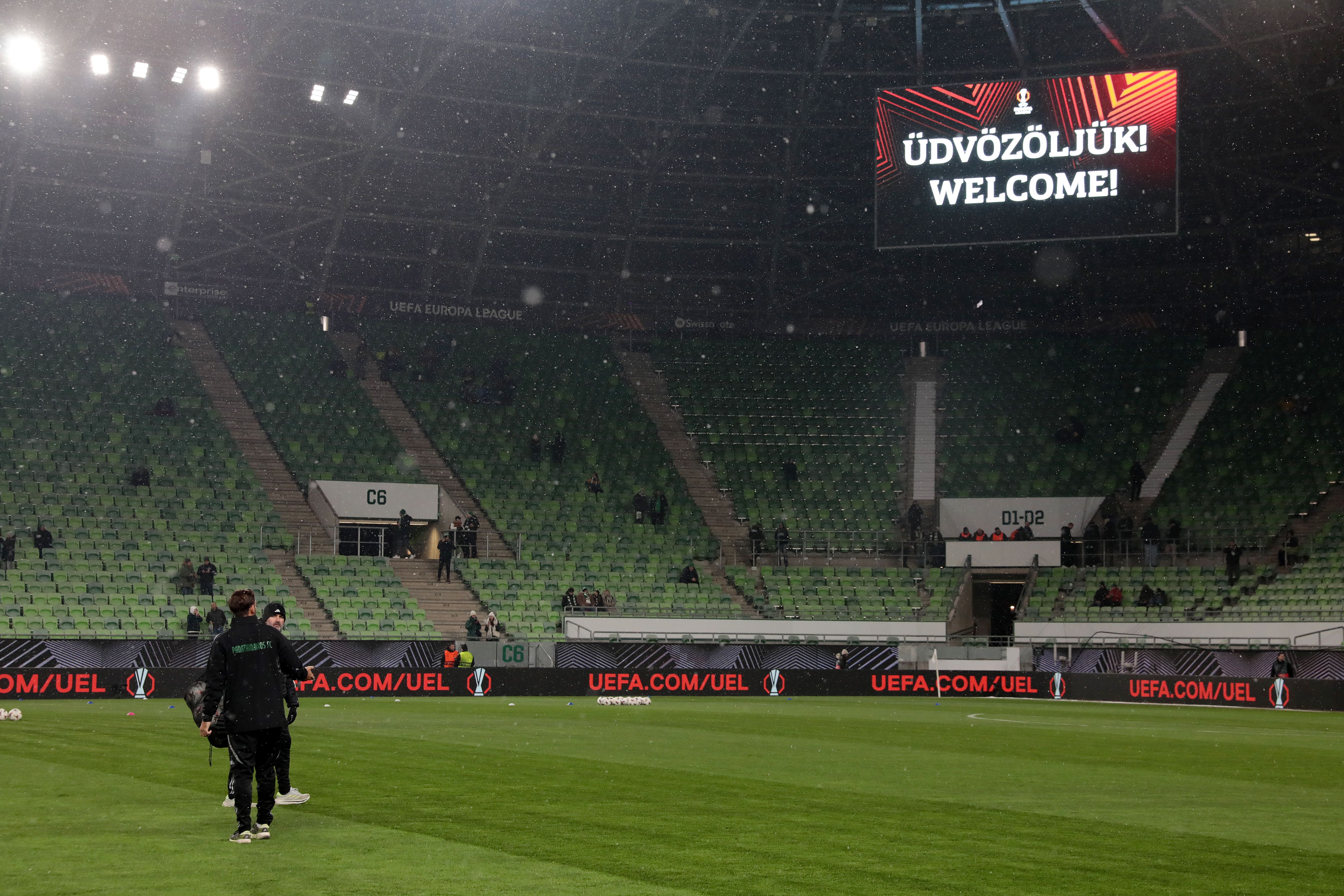 Σταμάτησε η χιονόπτωση στη Βουδαπέστη, το γήπεδο της Φερεντσβάρος δεν έχει γεμίσει ακόμα, σε δεκαπέντε λεπτά έχουμε παιχνίδι...