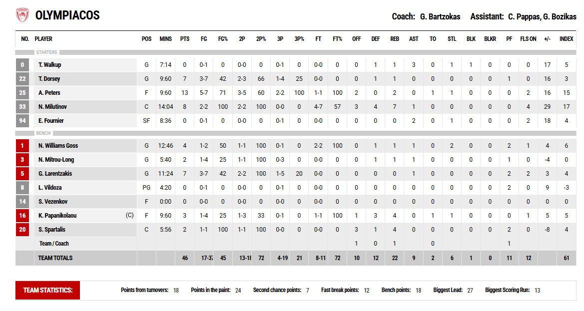 Για τον Ολυμπιακό Πίτερς και Ντόρσεϊ έχουν 20 και 17 πόντους αντίστοιχα.