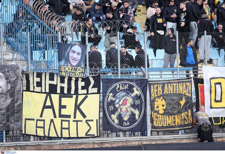 Οι 4 χιλιάδες φίλοι της ΑΕΚ έχουν στήσει το δικό τους «πάρτι» στις εξέδρες και δεν έχουν σταματήσει να τραγουδάνε.