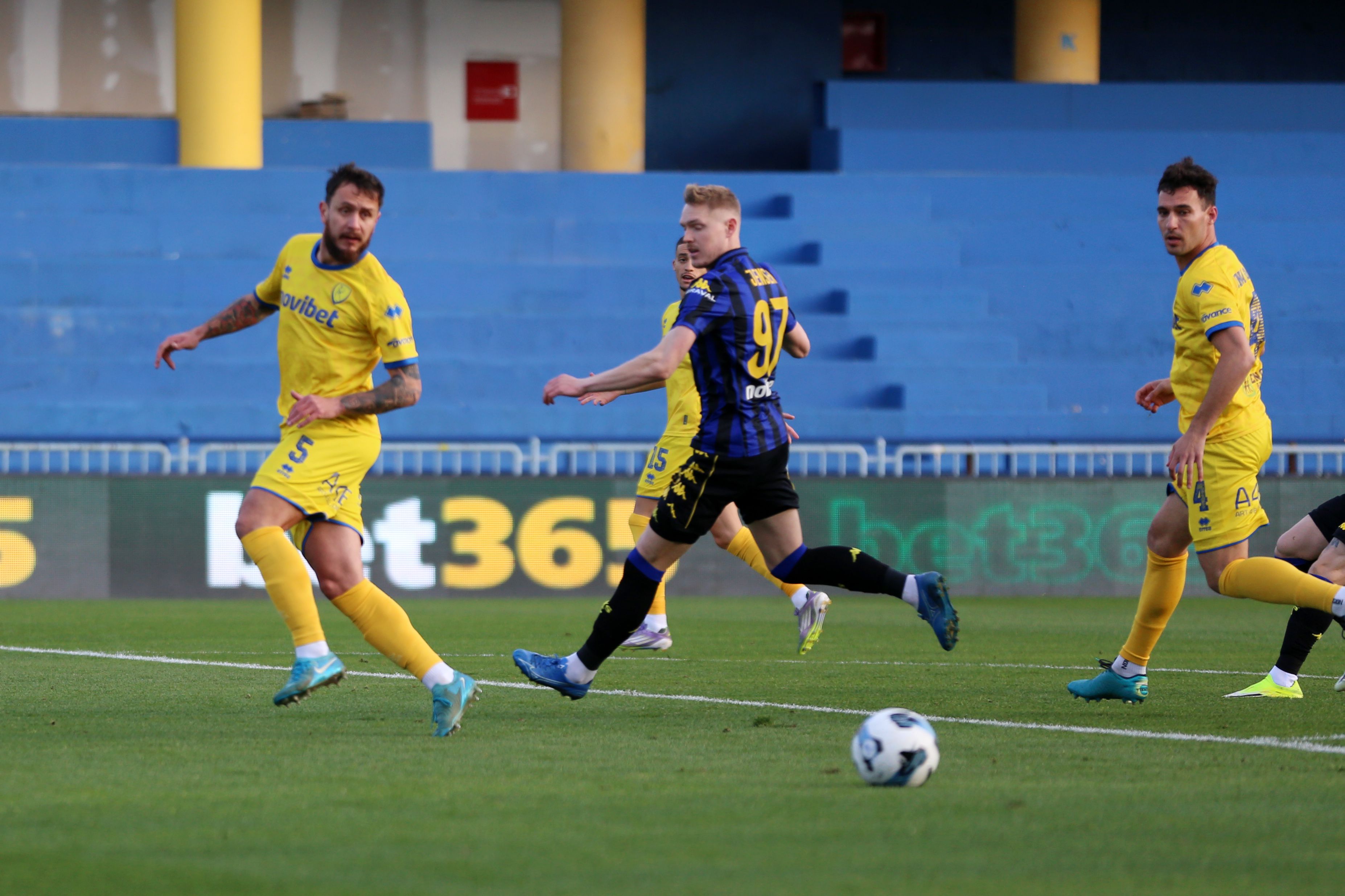 45+4' Απείλησε ο Άρης με ένα δυνατό σουτ του Μισεουί, άουτ η μπάλα.