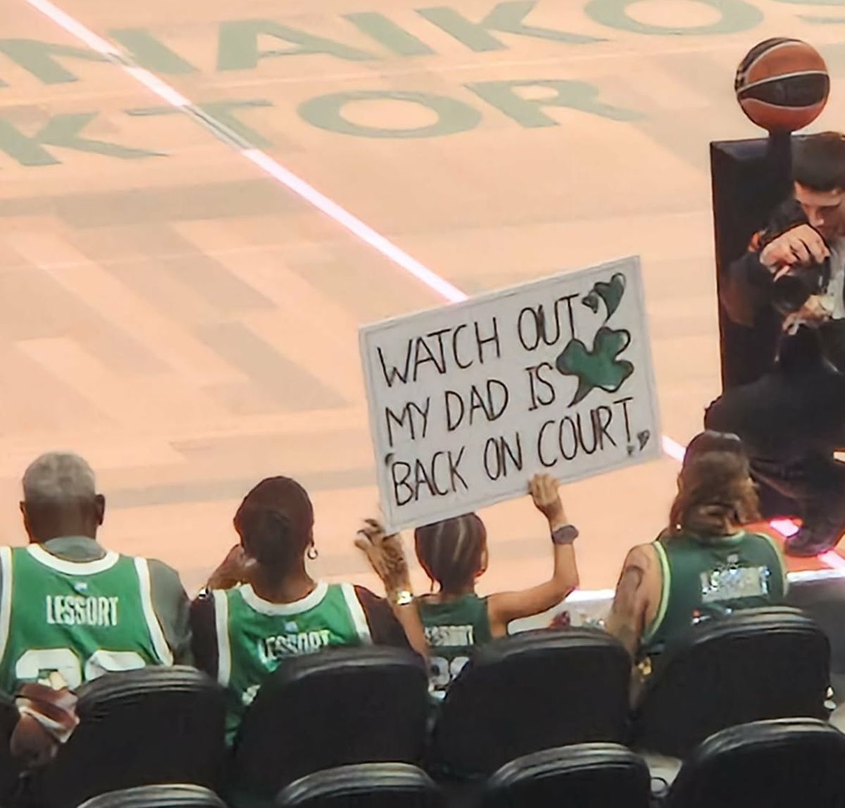 Οι γονείς του Λεσόρ βρίσκονται στις μπροστινές θέσεις, ενώ ο γιος του, Μάτσον, έκλεψε την παράσταση με το πλακάτ που κρατούσε: «Προσέξτε! Ο μπαμπάς μου επέστρεψε στο παρκέ.»